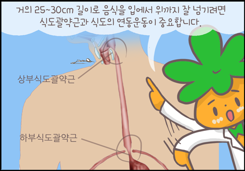 성인의 식도는 거의 25~30cm 길이로 음식을 입에서 위까지 잘 넘기려면 식도괄약근과 식도의 연동운동이 중요합니다.