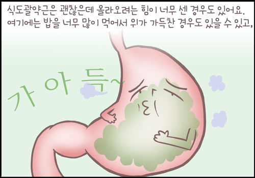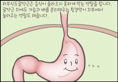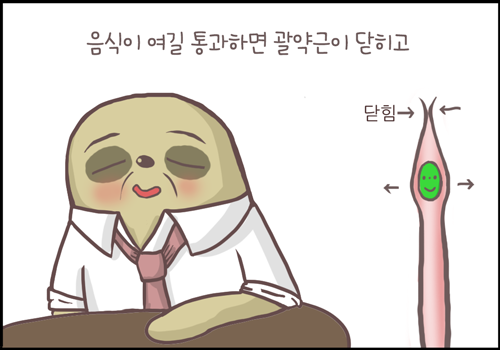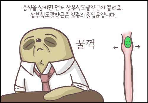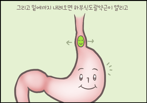 식도를 타고 쭉 내려온 음식은 하부식도괄약근에 닿게 되고 하부식도괄약근도 열렸다가 닫히면서 음식물을 위로 내보냅니다.