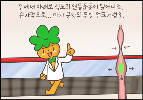 음식을 삼킬 때 상부식도괄약근이 열립니다. 상부식도괄약근은 일종의 출입문 역할을 합니다. 음식이 상부식도괄약근을 통과하면 다시 닫히게 되고 식도의 연동운동이 일어나면서 무빙워크처럼 음식물을 밑으로 내려줍니다.