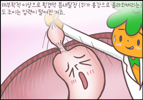 해부학적 이상으로 생기는 횡경막 틈새탈장은 횡경막 원인의 역류를 일으킵니다. 틈새탈장이란 위가 횡경막의 틈을 통해 흉강까지 일부가 올라와버리는 것입니다.