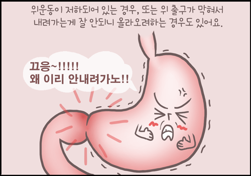 위 운동이 저하되어 있거나 위의 출구가 막혀서 잘 내려가지 않다 보니 거꾸로 올라오기도 합니다.