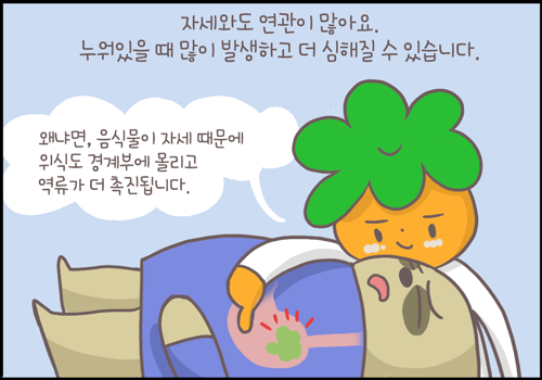 자세는 위식도역류에 중요합니다. 누워있다보면 음식물이 자세 때문에 위식도 경계부로 몰리고 역류가 더 촉진될 수 있습니다. 당연히 식사 후에 눕는 것은 안 좋겠죠?