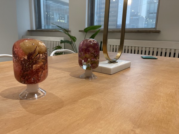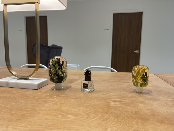 전혀 다른 종류의 식물도 있는데, 허발리움(Herbalrium)이라는 존재가 있다. 사무실처럼 해가 잘 들지 않고, 실내 환경이 건조하고 식물에 알맞지 않은 곳에 두고 보기 좋은 존재이다. 식물을 특처리한 용액에 담가 투명한 유리병에 두고 보도록 한 제품이다. 식물에서 색이 점점 빠져나와 몇 년이 지나면 버려야 할 수 있다지만, 일반적인 식물이 죽어 나가는 것보다는 훨씬 손도 덜 가고, 마음도 편한 방법일 수 있다. 허발리움도 네 종류를 테이블에 놓았는데, 종종 병원에서 대기하는 환자들이 나는 이 색이 예쁘다, 아니다 나는 이게 더 예쁜 것 같다. 하는 대화를 듣고 나면 뿌듯하기도 하고, 재미있기도 하다.