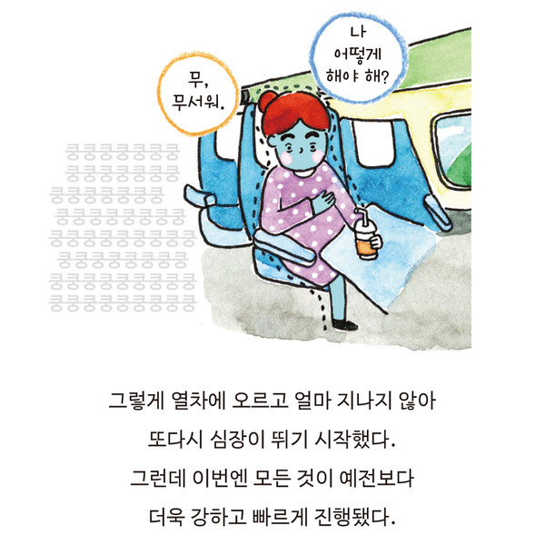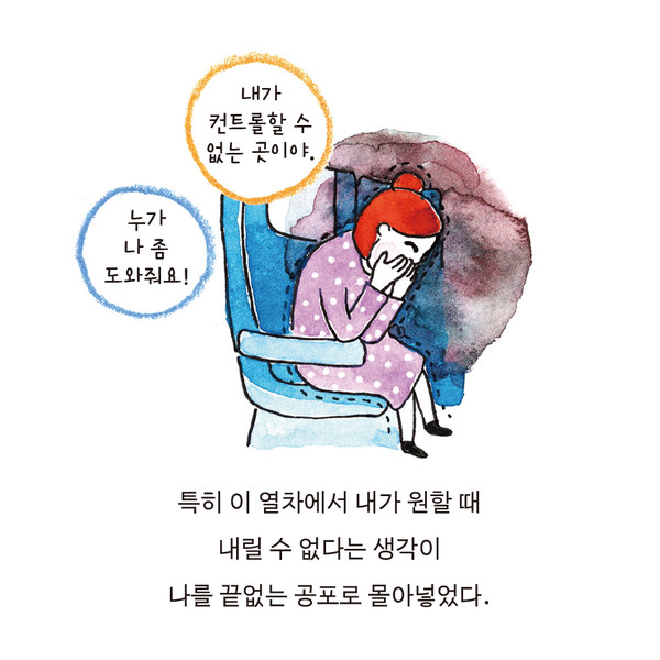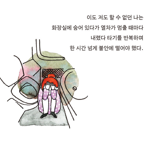 터질 것 같은 심장소리에 나도 모르게 가슴을 부여잡았다. 숨이 턱까지 차올라 가빠오고, 온몸에 식은땀이 흘러내렸다. 무슨 일이 생길 것 같아 초조해졌다. 내려야 한다는 생각에 창밖을 내다봤지만 이미 열차는 선로를 미끄러지듯 달리는 중이었다. 온몸이 땀으로 흠뻑 젖어버린 나는 엎친 데 덮친 격으로 배탈이 난 것처럼 배도 아팠다.