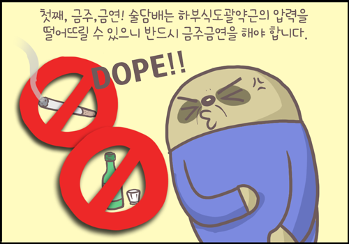 첫째는 금주 금연입니다. 술 담배는 하부식도괄약근의 압력을 떨어뜨릴 수 있으니 반드시 금주금연을 해야 합니다.
