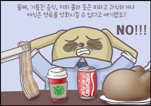 둘째, 기름진 음식, 커피, 콜라 등을 피하고 과식이나 야식을 역류를 악화시킬 수 있으니 최대한 피해야 합니다.