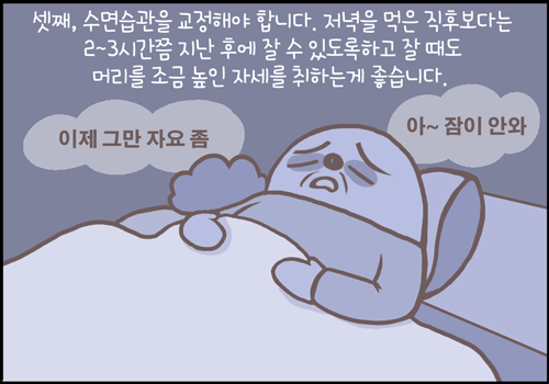 셋째, 수면습관을 교정해야 합니다. 저녁을 먹은 직후에 수면을 취하면 역류가 악화될 수 있습니다. 2~3시간 정도 지난 후에 잘 수 있도록 하고 잘 때도 머리를 조금 높인 자세를 취하는 것이 좋습니다.