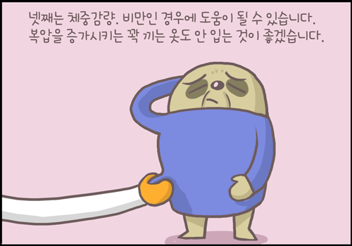 넷째, 체중감량, 비만인 경우에 도움이 될 수 있습니다. 복압을 증가시키는 꽉 끼는 옷도 안 입도록 합니다.
