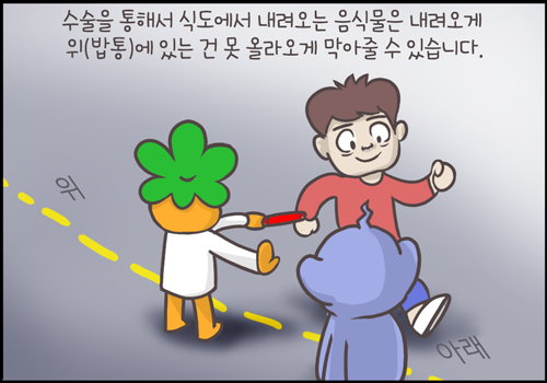 수술을 통해 하는 것은 하부식도괄약근복합체가 본래 하는 기능을 되돌려놓는 것입니다. 식도에서 내려오는 음식물을 내려갈 수 있도록 해주고 위에 있는 것은 식도로 올라가지 못하게 막아주는 것입니다.