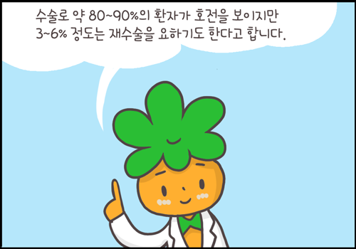 수술로 약 80~90%의 환자가 호전을 보이지만 3~6%는 재수술을 요하기도 합니다.