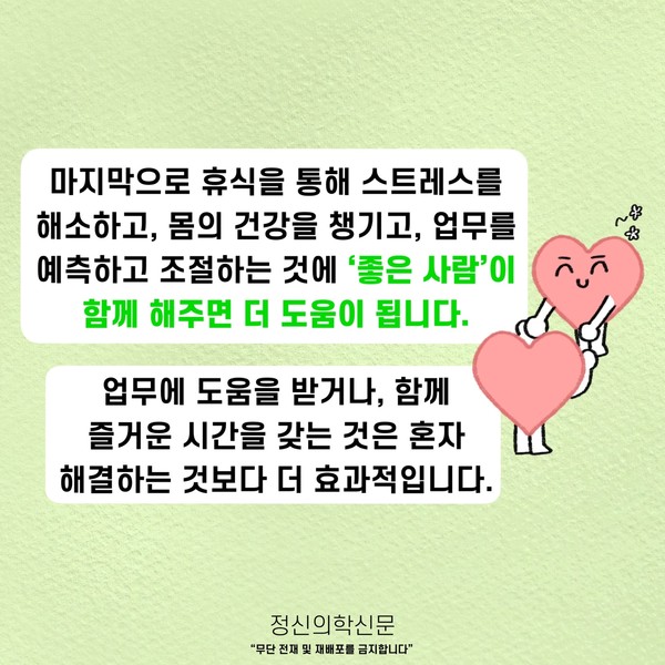 정두영 정신건강의학과 전문의 UNIST 바이오메디컬공학과 교수 정두영 정신건강의학과 전문의 UNIST 바이오메디컬공학과 교수 저서 <마음은 단단하게 인생은 유연하게> 출간 전체기사 보기 정두영 전문의의 대표칼럼 시니어의 뇌 건강을 위한 올바른 SNS 사용 방법 죽음을 생각하면 명료해지는 것들 - 가치 있는 일, 가치 있는 관계 '꼰대' 되지 않기 - 리더십과 정신건강 복수심이 삶의 전부가 될 때 - ‘더 글로리’ 문동은의 기쁨과 슬픔 ‘꺾이지 않는 마음’의 올바른 사용법 이태원 참사 논란 - 애도의 방식 관련기사 일에 지쳐 쓰러질 것 같은 사람에게 필요한 변화 쉼을 허락하지 않는 당신에게 제안하는 전략적 휴식 할 일을 미루지 않는 방법 7가지 일과 휴식을 함께, 디지털 노마드와 워케이션 키워드 #휴식 #번아웃 #스트레스 정두영 정신건강의학과 전문의 info.psynews@gmail.com 다른기사 보기 저작권자 © 정신의학신문 무단전재 및 재배포 금지 추천 뉴스 매 맞는 여성 증후군 - 사랑이라는 이름의 폭력이 남기는 상처 얼만큼 운동해야 우울증을 예방할까? 약만으로 부족할 때, 우울증에 효과적인 운동은 이것입니다 영웅의 숨겨진 아픔 - 소방관 트라우마 불안이 쉽게 사라지지 않는 뇌과학적 이유 [신간소개] 당신의 상처는 사적이지 않다 수면다원검사를 꼭 받아봐야 하는 사람 (Part 3) 우울증에 좋은 운동은 뭘까 댓글삭제 삭제한 댓글은 다시 복구할 수 없습니다. 그래도 삭제하시겠습니까? 비밀번호 닫기 기사 댓글 0 댓글 접기 댓글 내용입력 비회원 로그인 이름 비밀번호 댓글 내용입력 댓글쓰기 계정을 선택하시면 로그인·계정인증을 통해 댓글을 남기실 수 있습니다. 회원 로그인 비회원 글쓰기 이름 비밀번호 자동등록방지 로그인 옵션 창닫기 주요기사 대인기피증 사회불안장애 극복하기 [Doctor's Mail] 연속된 사업 실패, 재기를 위해 노력하지만 힘듭니다 아직은 괜찮습니다 6화 나는 언제나 완성되어가는 중이다 불안장애와 공황장애 어떻게 다른가요 수면의 질과 ADHD의 상호작용 약만으로 부족할 때, 우울증에 효과적인 운동은 이것입니다