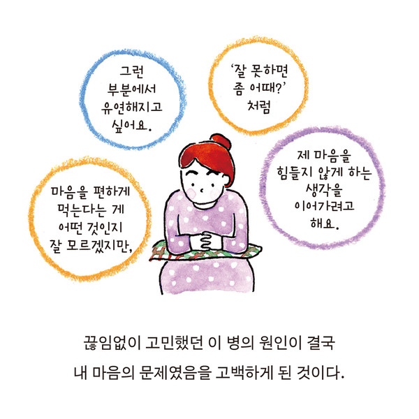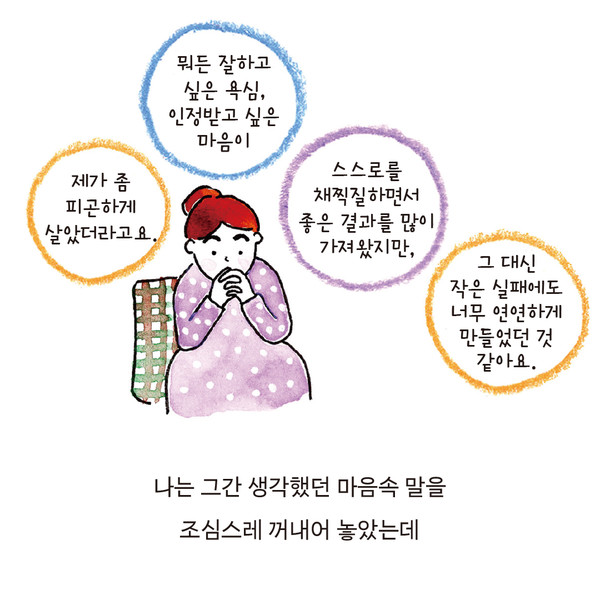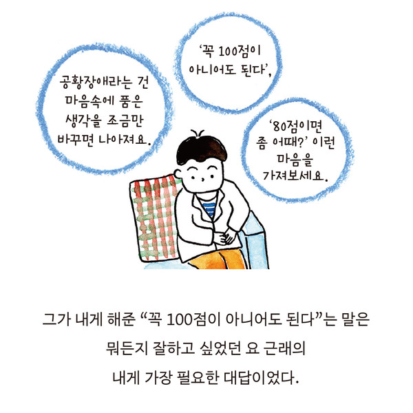 스스로 100점이 아닌 것 같아 자책하던 중 공황을 만났다. 그리고 지독한 마음의 병으로 모든 걸 잃을 위기에 처하고 나서야 비로소 깨달았다. 100점이 되고 나면 목표를 달성한 데서 오는 쾌감은 있겠지만 맘 편히 살 수는 없다는 것을. 100점을 위해 스스로를 다그치면 쉽게 불안해지고, 곧 한계가 온다는 것을 말이다. 선생님이 해준 80점이면 좀 어떠냐는 한마디에 10년 묵은 체증이 싹 내려가는 것처럼 후련한 기분을 느꼈던 건 어쩌면 살면서 한 번도 듣지 못했던, 그러나 간절히 듣고 싶었던 말이기 때문일 것이다.