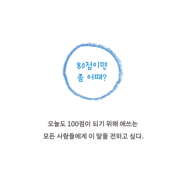 이제 더는 100점이 되기 위해 애쓰지 않기로 했다. 그 대신 조금 부족하더라도 있는 그대로의 나를 인정하고 바라보면서 좀 더 자신에게 너그러워지기로 마음먹었다. 타이트한 100점이 아닌 여유 있는 80점을 추구하는 삶. 그렇게 스스로에게 압박 대신 더 많은 박수를 보내는 삶을 꿈꾸게 되었다.