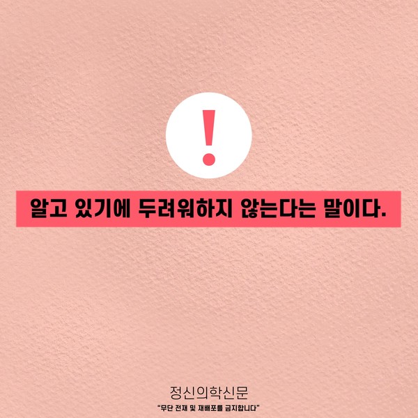 채정호 전문의의 대표칼럼 [카드뉴스] 내 마음의 알고리즘을 알 수 있는 방법 [카드뉴스] 인간은 “Human Being” ‘Being’ 하는 시간 [불안, 나를 태우는 또 다른 나 - 4] 우리는 어디에서 불안을 느낄까요? 불안이 무엇인지 잘 알고 이해하면 도망가지 않을 수 있다 불안을 제대로 이해하기 – ‘불안’하면 모든 게 ‘문제’일까?