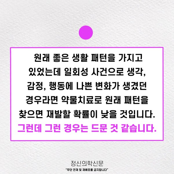 주요기사 대인기피증 사회불안장애 극복하기 [Doctor's Mail] 연속된 사업 실패, 재기를 위해 노력하지만 힘듭니다 아직은 괜찮습니다 6화 나는 언제나 완성되어가는 중이다 불안장애와 공황장애 어떻게 다른가요 수면의 질과 ADHD의 상호작용 약만으로 부족할 때, 우울증에 효과적인 운동은 이것입니다