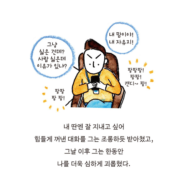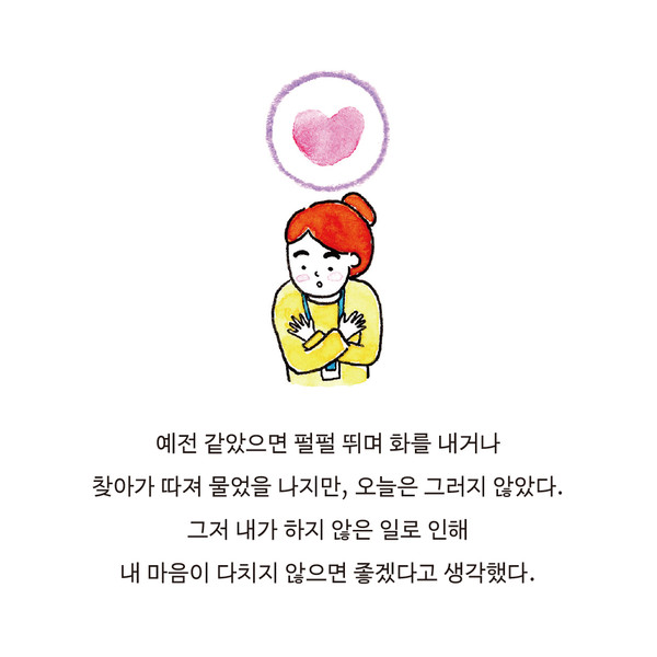 나는 더 이상 나에 관한 악플을 듣지 않기로 결정했다. 사실과 다른 말에 일일이 신경 쓰고 대응하는 게 얼마나 고된 일인지 알기 때문이다. 이야기를 전해준 동료는 이런 내 말에 조금 놀라며 앞으로는 절대로 전하지 않겠다고 했다. 그날 우리는 평소처럼 편의점에 가서 음료수를 사 먹으며 기분 좋은 이야기를 나누었다.