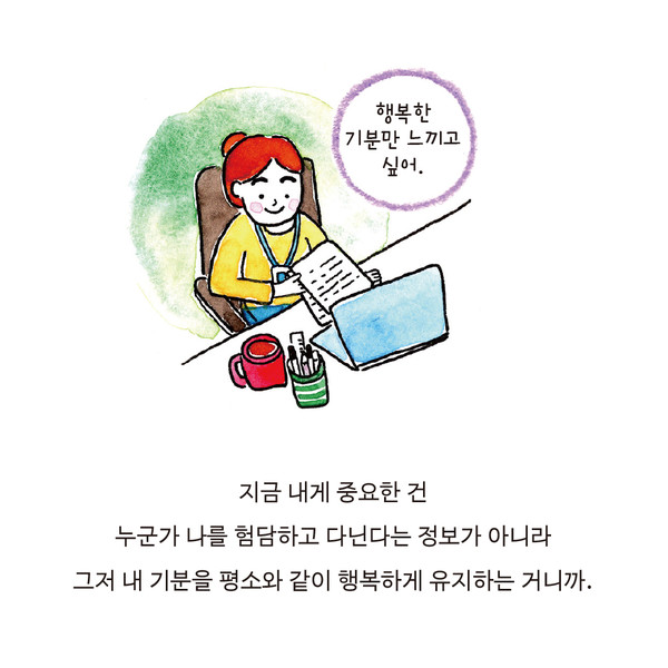 누가 나를 어떻게 생각하고 판단할지는 어차피 그 사람의 마음이다. 그 마음은 그들이 알아서 하게 놔두고 우리는 우리 마음을 지킬 방법을 찾자. 악플 때문에 슬퍼할 시간을 기분 좋은 일들로 가득 채우는 거다. “모르는 게 약”이라는 말처럼 눈을 질끈 감고 손으로 귀를 꼭 막는 것도 좋은 방법이 된다. 알아서 해결되지 않는 일이라면 오히려 모르는 게 마음은 더 편하다.