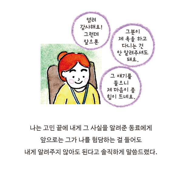 “염려해주셔서 감사해요. 그런데 앞으론 그분이 제 욕을 하는 걸 듣더라도 제게 알려주지 않으셨으면 좋겠어요. 그 얘기를 들으니 제 마음이 좀 힘이 드네요.”