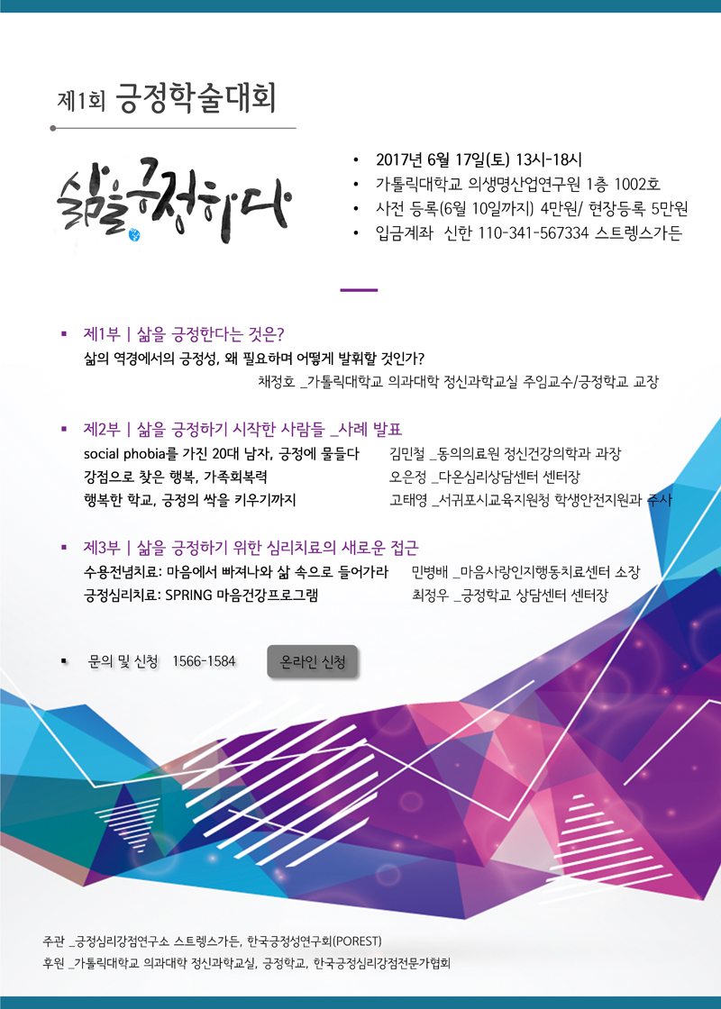 제1회 긍정학술대회는 6월 17일 토요일 오후 1시에서 6시까지 가톨릭대학교 의생명산업연구원에서 진행되며 참여신청은 긍정학교 홈페이지(www.positiveschool.co.kr)에서 6월10일까지 사전신청 가능하다.