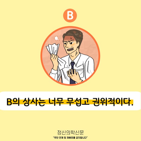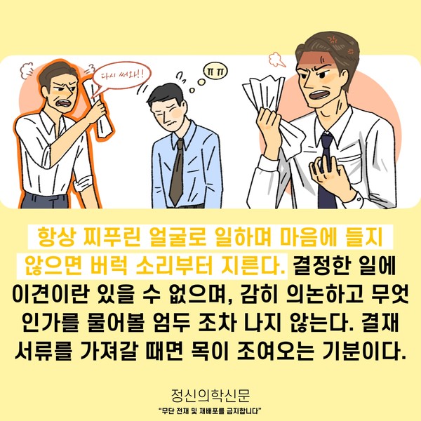 관련기사 이런 상사 꼭 있다! 키워드 #직장상사 #부하직원 정선우 정신건강의학과 전문의 info.psynews@gmail.com 다른기사 보기 저작권자 © 정신의학신문 무단전재 및 재배포 금지 추천 뉴스 매 맞는 여성 증후군 - 사랑이라는 이름의 폭력이 남기는 상처 얼만큼 운동해야 우울증을 예방할까? 약만으로 부족할 때, 우울증에 효과적인 운동은 이것입니다 영웅의 숨겨진 아픔 - 소방관 트라우마 불안이 쉽게 사라지지 않는 뇌과학적 이유 [신간소개] 당신의 상처는 사적이지 않다 수면다원검사를 꼭 받아봐야 하는 사람 (Part 3) 우울증에 좋은 운동은 뭘까 댓글삭제 삭제한 댓글은 다시 복구할 수 없습니다. 그래도 삭제하시겠습니까? 비밀번호 닫기 기사 댓글 0 댓글 접기 댓글 내용입력 비회원 로그인 이름 비밀번호 댓글 내용입력 댓글쓰기 계정을 선택하시면 로그인·계정인증을 통해 댓글을 남기실 수 있습니다. 회원 로그인 비회원 글쓰기 이름 비밀번호 자동등록방지 로그인 옵션 창닫기 주요기사 대인기피증 사회불안장애 극복하기 [Doctor's Mail] 연속된 사업 실패, 재기를 위해 노력하지만 힘듭니다 아직은 괜찮습니다 6화 나는 언제나 완성되어가는 중이다 불안장애와 공황장애 어떻게 다른가요 수면의 질과 ADHD의 상호작용 약만으로 부족할 때, 우울증에 효과적인 운동은 이것입니다