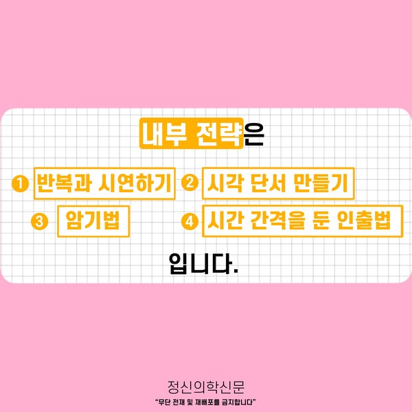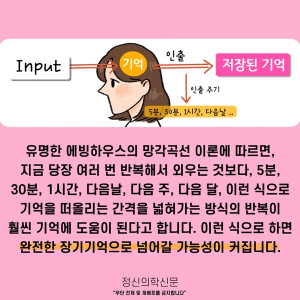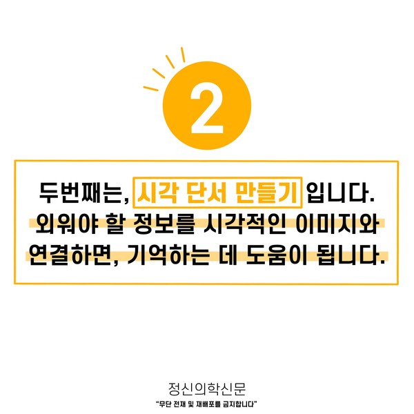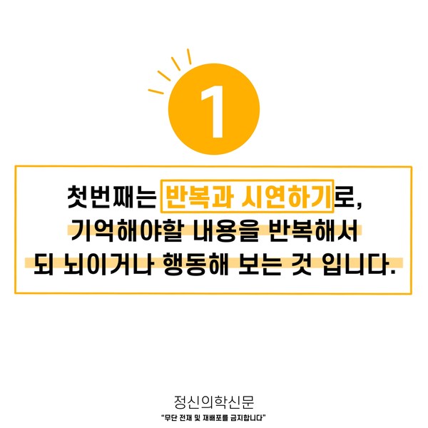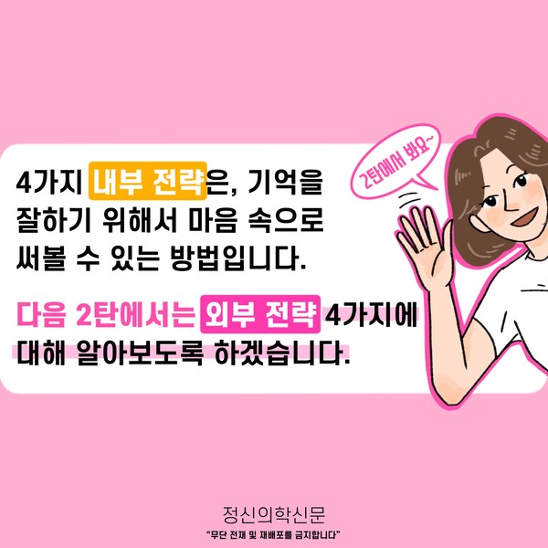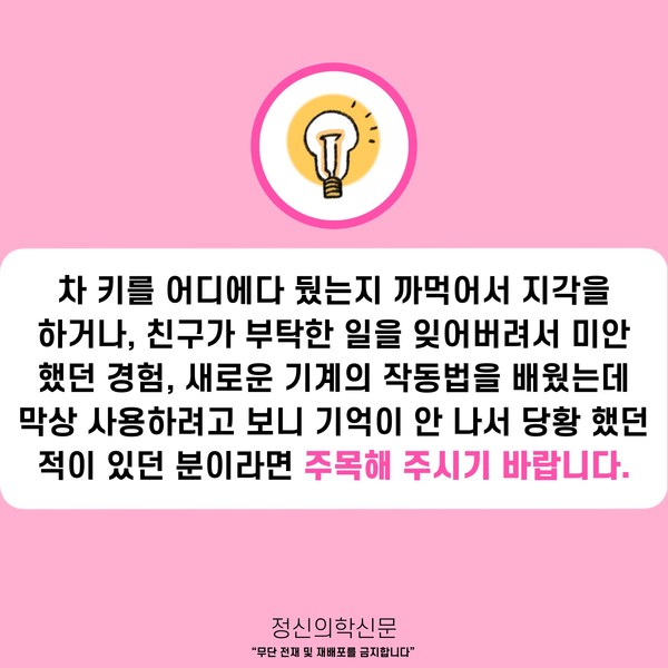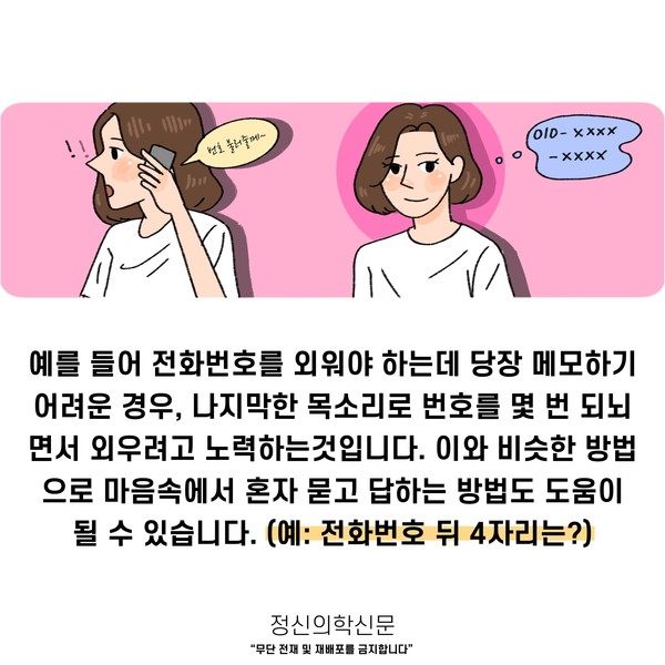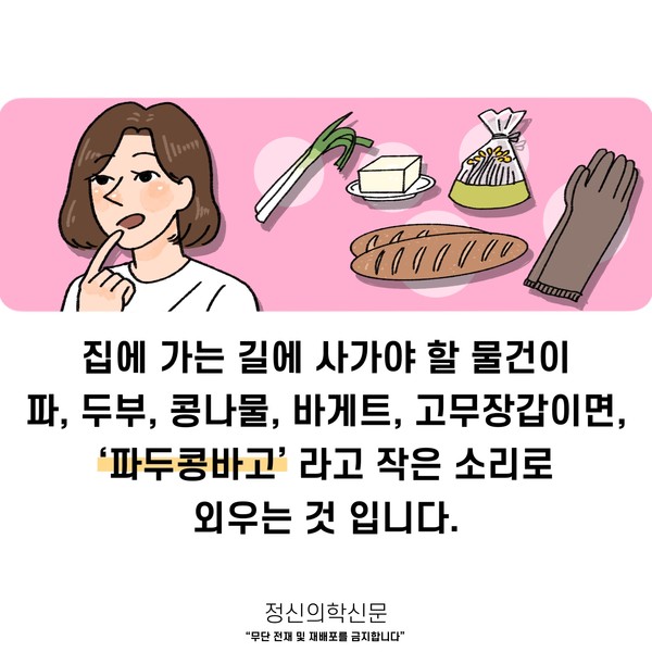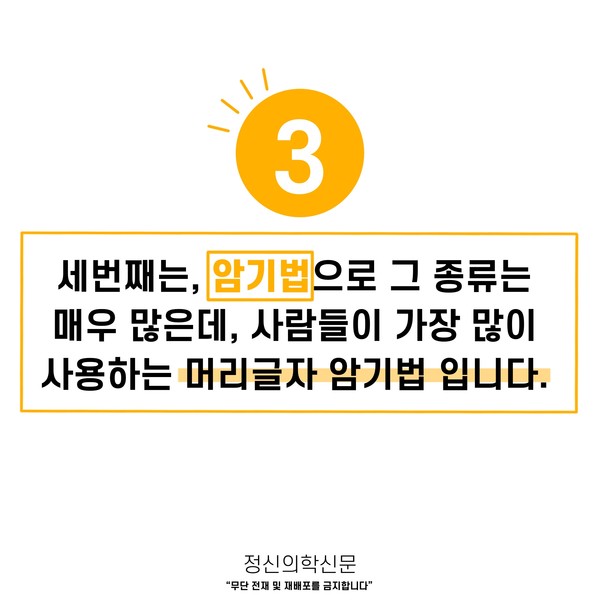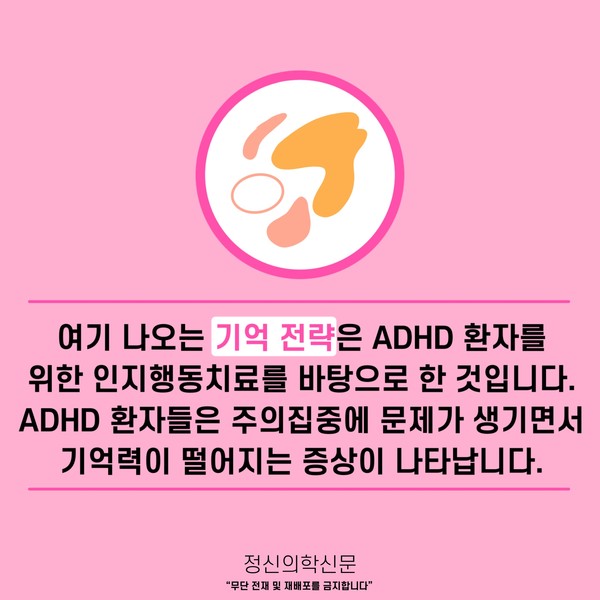 관련기사 기억력을 높이려면? - ADHD에서 기억력을 돕는 전략 [카드뉴스] 기억력을 높이는 8가지 전략 -2편- 행운의 숫자, 매직넘버 7과 단기기억 키워드 #기억력 #ADHD 이현정 정신건강의학과 전문의 info.psynews@gmail.com 다른기사 보기 저작권자 © 정신의학신문 무단전재 및 재배포 금지 추천 뉴스 매 맞는 여성 증후군 - 사랑이라는 이름의 폭력이 남기는 상처 얼만큼 운동해야 우울증을 예방할까? 영웅의 숨겨진 아픔 - 소방관 트라우마 약만으로 부족할 때, 우울증에 효과적인 운동은 이것입니다 불안이 쉽게 사라지지 않는 뇌과학적 이유 [신간소개] 당신의 상처는 사적이지 않다 수면다원검사를 꼭 받아봐야 하는 사람 (Part 3) 우울증에 좋은 운동은 뭘까 댓글삭제 삭제한 댓글은 다시 복구할 수 없습니다. 그래도 삭제하시겠습니까? 비밀번호 닫기 기사 댓글 0 댓글 접기 댓글 내용입력 비회원 로그인 이름 비밀번호 댓글 내용입력 댓글쓰기 계정을 선택하시면 로그인·계정인증을 통해 댓글을 남기실 수 있습니다. 회원 로그인 비회원 글쓰기 이름 비밀번호 자동등록방지 로그인 옵션 창닫기 주요기사 대인기피증 사회불안장애 극복하기 [Doctor's Mail] 연속된 사업 실패, 재기를 위해 노력하지만 힘듭니다 아직은 괜찮습니다 6화 나는 언제나 완성되어가는 중이다 불안장애와 공황장애 어떻게 다른가요 수면의 질과 ADHD의 상호작용 약만으로 부족할 때, 우울증에 효과적인 운동은 이것입니다