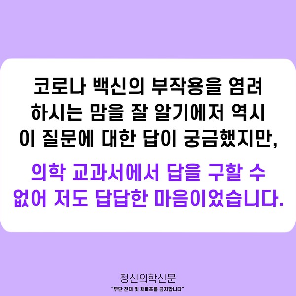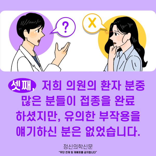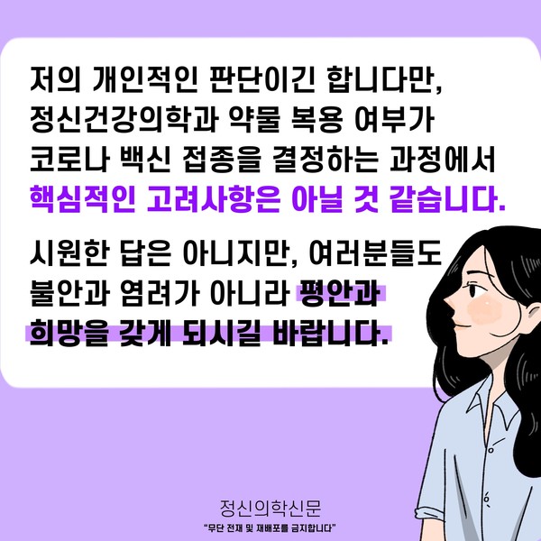 관련기사 슬하편지 - 정신건강의학과 약을 먹고 있는데 코로나 백신을 맞아도 되나요? 키워드 #코로나 #코로나19 #백신 #코로나백신 #부작용 #약물간상호작용 오동훈 정신건강의학과 전문의 info.psynews@gmail.com 다른기사 보기 저작권자 © 정신의학신문 무단전재 및 재배포 금지 추천 뉴스 매 맞는 여성 증후군 - 사랑이라는 이름의 폭력이 남기는 상처 얼만큼 운동해야 우울증을 예방할까? 약만으로 부족할 때, 우울증에 효과적인 운동은 이것입니다 영웅의 숨겨진 아픔 - 소방관 트라우마 불안이 쉽게 사라지지 않는 뇌과학적 이유 [신간소개] 당신의 상처는 사적이지 않다 수면다원검사를 꼭 받아봐야 하는 사람 (Part 3) 우울증에 좋은 운동은 뭘까 댓글삭제 삭제한 댓글은 다시 복구할 수 없습니다. 그래도 삭제하시겠습니까? 비밀번호 닫기 기사 댓글 0 댓글 접기 댓글 내용입력 비회원 로그인 이름 비밀번호 댓글 내용입력 댓글쓰기 계정을 선택하시면 로그인·계정인증을 통해 댓글을 남기실 수 있습니다. 회원 로그인 비회원 글쓰기 이름 비밀번호 자동등록방지 로그인 옵션 창닫기 주요기사 대인기피증 사회불안장애 극복하기 [Doctor's Mail] 연속된 사업 실패, 재기를 위해 노력하지만 힘듭니다 아직은 괜찮습니다 6화 나는 언제나 완성되어가는 중이다 불안장애와 공황장애 어떻게 다른가요 수면의 질과 ADHD의 상호작용 약만으로 부족할 때, 우울증에 효과적인 운동은 이것입니다