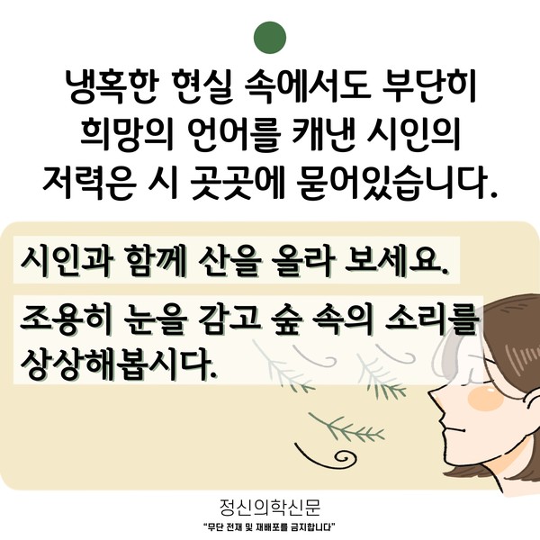 황인환 정신건강의학과 전문의 여의도힐 정신건강의학과 원장 황인환 정신건강의학과 전문의 여의도힐 정신건강의학과 원장 한양대학교 의과대학 학사, 석사 대한신경정신의학회 정회원 저서 <마음은 괜찮냐고 시가 물었다> 전문의 홈 가기 애독자 응원 한 마디 "세상에 자신의 글을 통해 작은 생각의 변화를 이끄는 선생님의 노력이 아름답다고 생각합니다. 좋은 글 감사합니다." 황인환 전문의의 대표칼럼 집이 주는 만족감, 홈 스윗 홈을 원한다면? 조직 성공을 위한 복권 티켓을 잡는 법 - 복권 티켓 가설 환경이 우리 마음에 미치는 영향, 루시퍼 이펙트 알고리즘이 만드는 신념- 필터 버블(Filter Bubble) 인정과 성장을 동시에 이끌어내는 피드백 샌드위치 (feedback sandwich) 인지적 재평가 - 감정 조절과 갈등 해결의 열쇠 관련기사 나를 버리고 내려놓기 – 삶의 근심과 고단함에서 돌아와 거니는 숲이여 : 김용택의 ‘그대 생의 솔숲에서’ 키워드 #근심 #고단함 #걱정 #김용택 #그대생의솔숲에서 황인환 정신건강의학과 전문의 info.psynews@gmail.com 다른기사 보기 저작권자 © 정신의학신문 무단전재 및 재배포 금지 추천 뉴스 매 맞는 여성 증후군 - 사랑이라는 이름의 폭력이 남기는 상처 얼만큼 운동해야 우울증을 예방할까? 약만으로 부족할 때, 우울증에 효과적인 운동은 이것입니다 영웅의 숨겨진 아픔 - 소방관 트라우마 불안이 쉽게 사라지지 않는 뇌과학적 이유 [신간소개] 당신의 상처는 사적이지 않다 수면다원검사를 꼭 받아봐야 하는 사람 (Part 3) 우울증에 좋은 운동은 뭘까 댓글삭제 삭제한 댓글은 다시 복구할 수 없습니다. 그래도 삭제하시겠습니까? 비밀번호 닫기 기사 댓글 0 댓글 접기 댓글 내용입력 비회원 로그인 이름 비밀번호 댓글 내용입력 댓글쓰기 계정을 선택하시면 로그인·계정인증을 통해 댓글을 남기실 수 있습니다. 회원 로그인 비회원 글쓰기 이름 비밀번호 자동등록방지 로그인 옵션 창닫기 주요기사 대인기피증 사회불안장애 극복하기 [Doctor's Mail] 연속된 사업 실패, 재기를 위해 노력하지만 힘듭니다 아직은 괜찮습니다 6화 나는 언제나 완성되어가는 중이다 불안장애와 공황장애 어떻게 다른가요 수면의 질과 ADHD의 상호작용 약만으로 부족할 때, 우울증에 효과적인 운동은 이것입니다