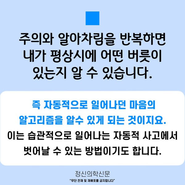 채정호 전문의의 대표칼럼 [카드뉴스] 인간은 “Human Being” ‘Being’ 하는 시간 [불안, 나를 태우는 또 다른 나 - 4] [카드뉴스] 공황 발작이 와도 도망가지 않으려면 우리는 어디에서 불안을 느낄까요? 불안이 무엇인지 잘 알고 이해하면 도망가지 않을 수 있다 불안을 제대로 이해하기 – ‘불안’하면 모든 게 ‘문제’일까?