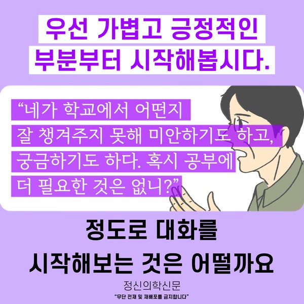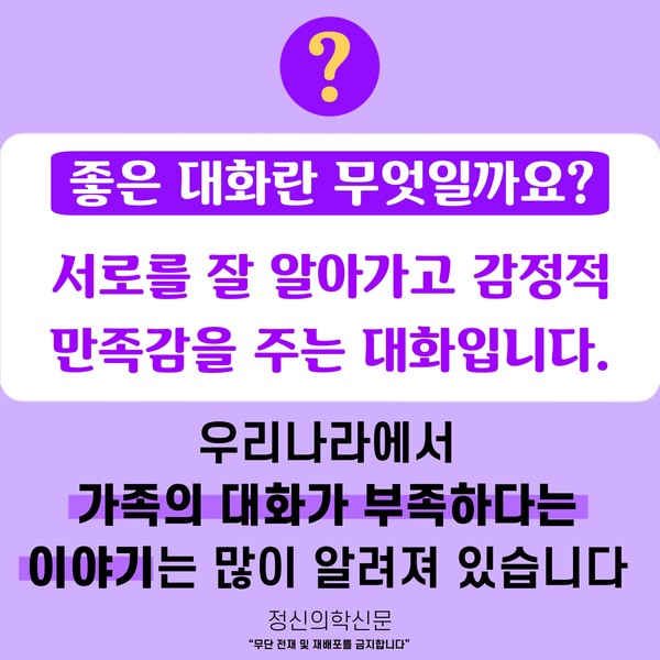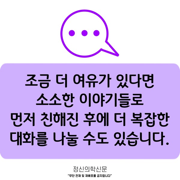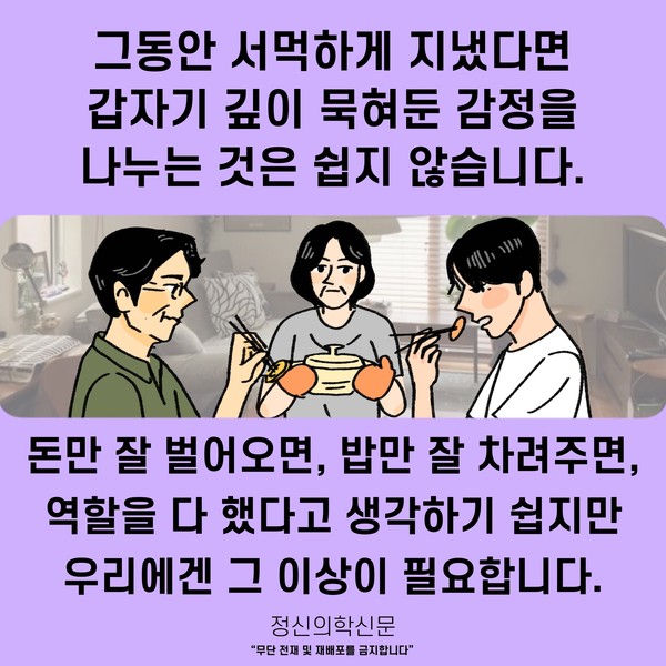 정두영 정신건강의학과 전문의 UNIST 바이오메디컬공학과 교수 정두영 정신건강의학과 전문의 UNIST 바이오메디컬공학과 교수 저서 <마음은 단단하게 인생은 유연하게> 출간 전체기사 보기 정두영 전문의의 대표칼럼 시니어의 뇌 건강을 위한 올바른 SNS 사용 방법 죽음을 생각하면 명료해지는 것들 - 가치 있는 일, 가치 있는 관계 '꼰대' 되지 않기 - 리더십과 정신건강 복수심이 삶의 전부가 될 때 - ‘더 글로리’ 문동은의 기쁨과 슬픔 ‘꺾이지 않는 마음’의 올바른 사용법 이태원 참사 논란 - 애도의 방식 관련기사 자녀와 대화를 원활하게 하는 방법 키워드 #가족 #대화 #소통 #가족끼리 대화하는법 정두영 정신건강의학과 전문의 info.psynews@gmail.com 다른기사 보기 저작권자 © 정신의학신문 무단전재 및 재배포 금지 추천 뉴스 매 맞는 여성 증후군 - 사랑이라는 이름의 폭력이 남기는 상처 얼만큼 운동해야 우울증을 예방할까? 약만으로 부족할 때, 우울증에 효과적인 운동은 이것입니다 영웅의 숨겨진 아픔 - 소방관 트라우마 불안이 쉽게 사라지지 않는 뇌과학적 이유 [신간소개] 당신의 상처는 사적이지 않다 수면다원검사를 꼭 받아봐야 하는 사람 (Part 3) 우울증에 좋은 운동은 뭘까 댓글삭제 삭제한 댓글은 다시 복구할 수 없습니다. 그래도 삭제하시겠습니까? 비밀번호 닫기 기사 댓글 0 댓글 접기 댓글 내용입력 비회원 로그인 이름 비밀번호 댓글 내용입력 댓글쓰기 계정을 선택하시면 로그인·계정인증을 통해 댓글을 남기실 수 있습니다. 회원 로그인 비회원 글쓰기 이름 비밀번호 자동등록방지 로그인 옵션 창닫기 주요기사 대인기피증 사회불안장애 극복하기 [Doctor's Mail] 연속된 사업 실패, 재기를 위해 노력하지만 힘듭니다 아직은 괜찮습니다 6화 나는 언제나 완성되어가는 중이다 불안장애와 공황장애 어떻게 다른가요 수면의 질과 ADHD의 상호작용 약만으로 부족할 때, 우울증에 효과적인 운동은 이것입니다