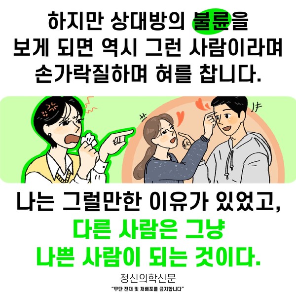 이일준 정신건강의학과 전문의 이일준 정신건강의학과 전문의 전체기사 보기 이일준 전문의의 대표칼럼 세상은 빙그레 씨발이다 - 영화 '길복순' 언론은 사람들을 어떻게 현혹하는가? [카드뉴스] 오징어 게임이 건드린 무의식 신의 의도는 누가 만들었는가? (feat. 넷플릭스 지옥) 넷플릭스 '지옥', 새진리회 의장 정진수의 심리 분석 [카드뉴스] 심리학에서 보는 협상의 기술 관련기사 대장동 의혹, 끊이지 않고 반복되는 그들만의 리그 키워드 #내로남불 #근본적귀인오류 #상황귀인 #성향귀인 #내로남불원인 이일준 정신건강의학과 전문의 info.psynews@gmail.com 다른기사 보기 저작권자 © 정신의학신문 무단전재 및 재배포 금지 추천 뉴스 매 맞는 여성 증후군 - 사랑이라는 이름의 폭력이 남기는 상처 얼만큼 운동해야 우울증을 예방할까? 영웅의 숨겨진 아픔 - 소방관 트라우마 약만으로 부족할 때, 우울증에 효과적인 운동은 이것입니다 불안이 쉽게 사라지지 않는 뇌과학적 이유 [신간소개] 당신의 상처는 사적이지 않다 수면다원검사를 꼭 받아봐야 하는 사람 (Part 3) 우울증에 좋은 운동은 뭘까 댓글삭제 삭제한 댓글은 다시 복구할 수 없습니다. 그래도 삭제하시겠습니까? 비밀번호 닫기 기사 댓글 0 댓글 접기 댓글 내용입력 비회원 로그인 이름 비밀번호 댓글 내용입력 댓글쓰기 계정을 선택하시면 로그인·계정인증을 통해 댓글을 남기실 수 있습니다. 회원 로그인 비회원 글쓰기 이름 비밀번호 자동등록방지 로그인 옵션 창닫기 주요기사 대인기피증 사회불안장애 극복하기 [Doctor's Mail] 연속된 사업 실패, 재기를 위해 노력하지만 힘듭니다 아직은 괜찮습니다 6화 나는 언제나 완성되어가는 중이다 불안장애와 공황장애 어떻게 다른가요 수면의 질과 ADHD의 상호작용 약만으로 부족할 때, 우울증에 효과적인 운동은 이것입니다