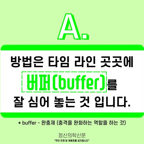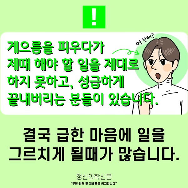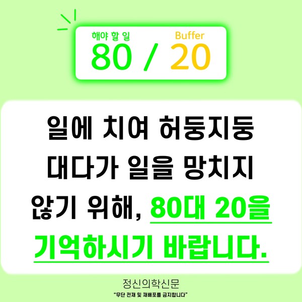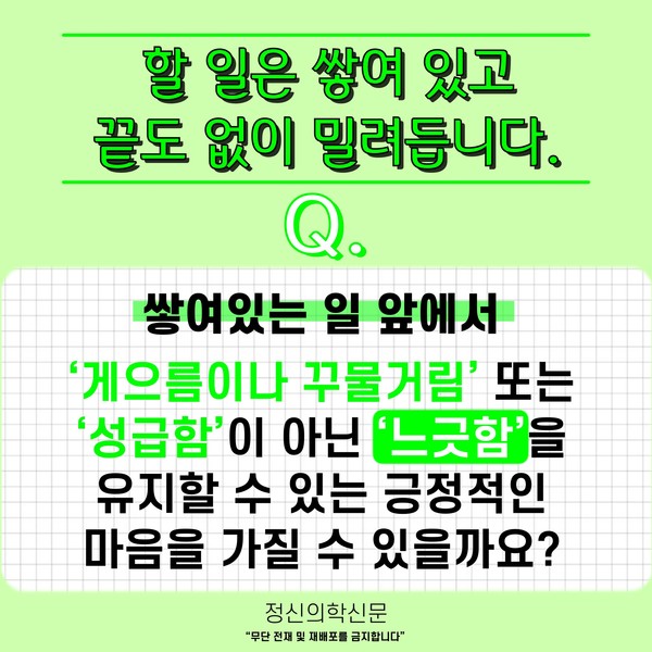 관련기사 나를 지키는 힘, ‘일정의 빈틈’ 키워드 #게으름 #버퍼 #완충제 #여유 #성급함 김재원 정신건강의학과 전문의 info.psynews@gmail.com 다른기사 보기 저작권자 © 정신의학신문 무단전재 및 재배포 금지 추천 뉴스 매 맞는 여성 증후군 - 사랑이라는 이름의 폭력이 남기는 상처 얼만큼 운동해야 우울증을 예방할까? 약만으로 부족할 때, 우울증에 효과적인 운동은 이것입니다 영웅의 숨겨진 아픔 - 소방관 트라우마 불안이 쉽게 사라지지 않는 뇌과학적 이유 [신간소개] 당신의 상처는 사적이지 않다 수면다원검사를 꼭 받아봐야 하는 사람 (Part 3) 우울증에 좋은 운동은 뭘까 댓글삭제 삭제한 댓글은 다시 복구할 수 없습니다. 그래도 삭제하시겠습니까? 비밀번호 닫기 기사 댓글 0 댓글 접기 댓글 내용입력 비회원 로그인 이름 비밀번호 댓글 내용입력 댓글쓰기 계정을 선택하시면 로그인·계정인증을 통해 댓글을 남기실 수 있습니다. 회원 로그인 비회원 글쓰기 이름 비밀번호 자동등록방지 로그인 옵션 창닫기 주요기사 대인기피증 사회불안장애 극복하기 [Doctor's Mail] 연속된 사업 실패, 재기를 위해 노력하지만 힘듭니다 아직은 괜찮습니다 6화 나는 언제나 완성되어가는 중이다 불안장애와 공황장애 어떻게 다른가요 수면의 질과 ADHD의 상호작용 약만으로 부족할 때, 우울증에 효과적인 운동은 이것입니다