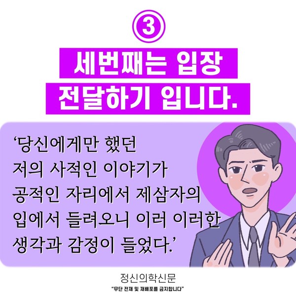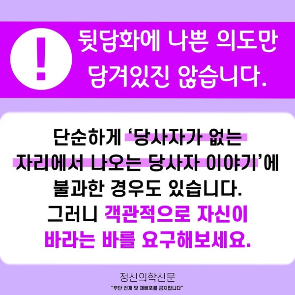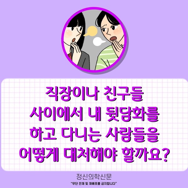 관련기사 [Doctor's Mail] 앞에서는 친한 척. 뒤에서는 뒷담화. 키워드 #뒷담화 #뒷담 #뒷얘기 #뒷담화대처법 #뒷담화대응법 최강록 정신건강의학과 전문의 info.psynews@gmail.com 다른기사 보기 저작권자 © 정신의학신문 무단전재 및 재배포 금지 추천 뉴스 매 맞는 여성 증후군 - 사랑이라는 이름의 폭력이 남기는 상처 얼만큼 운동해야 우울증을 예방할까? 영웅의 숨겨진 아픔 - 소방관 트라우마 약만으로 부족할 때, 우울증에 효과적인 운동은 이것입니다 불안이 쉽게 사라지지 않는 뇌과학적 이유 [신간소개] 당신의 상처는 사적이지 않다 수면다원검사를 꼭 받아봐야 하는 사람 (Part 3) 우울증에 좋은 운동은 뭘까 댓글삭제 삭제한 댓글은 다시 복구할 수 없습니다. 그래도 삭제하시겠습니까? 비밀번호 닫기 기사 댓글 0 댓글 접기 댓글 내용입력 비회원 로그인 이름 비밀번호 댓글 내용입력 댓글쓰기 계정을 선택하시면 로그인·계정인증을 통해 댓글을 남기실 수 있습니다. 회원 로그인 비회원 글쓰기 이름 비밀번호 자동등록방지 로그인 옵션 창닫기 주요기사 대인기피증 사회불안장애 극복하기 [Doctor's Mail] 연속된 사업 실패, 재기를 위해 노력하지만 힘듭니다 아직은 괜찮습니다 6화 나는 언제나 완성되어가는 중이다 불안장애와 공황장애 어떻게 다른가요 수면의 질과 ADHD의 상호작용 약만으로 부족할 때, 우울증에 효과적인 운동은 이것입니다