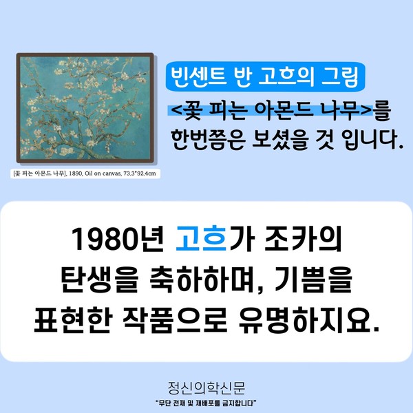 장상식 2022-02-26 00:07:18 더보기 삭제하기 [카드뉴스] 불 태워진 꽃피는 아몬드 나무의 제작년도가 1890년도 인 것으로 알고 있습니다. 혹시 1890을 1980으로 오기하신것은 아니신지요. 정신의학신문, 고맙게 잘 보고 있습니다.