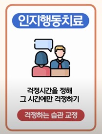 이러한 습관을 교정하기 위한 훈련은 인지행동치료를 통해 시도해 보는 것이 가장 효과적입니다. 범불안장애를 해결하기 위해 잘못된 인지과정을 교정하고 행동 습관을 바꾸는 인지행동치료는 그 효과가 이미 매우 잘 검증되어 있습니다. 오늘은 여러 가지 인지행동치료 가운데 한 가지를 소개해 드리고자 합니다. 바로 ‘걱정시간 만들기’입니다.