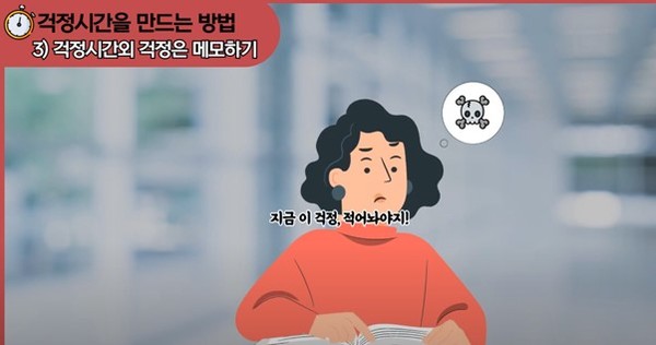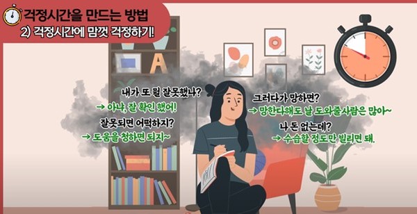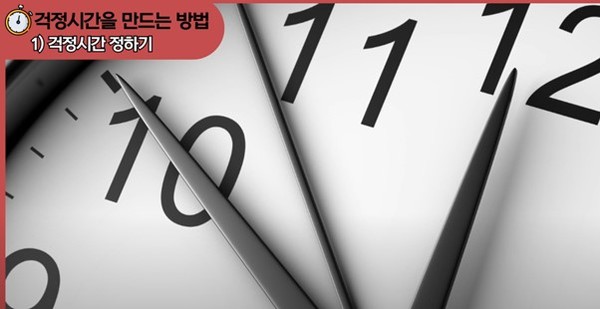 우선은 하루 중 매일 편하게 시간을 낼 수 있는 시간을 정해 ‘걱정시간’으로 정해 놓아야 합니다. 자기 전 저녁 시간이 보통 걱정시간으로 활용하기에 좋습니다. 하루 동안의 걱정을 마무리하는 시간이 될 수 있기 때문입니다. 걱정시간은 한 시간 정도로 여유 있게 잡아 두는 것이 좋습니다. 예를 들면, 저녁 9시부터 10시까지, 이런 식으로 매일매일 규칙적으로 걱정할 수 있는 나만의 일과를 만들어 두는 것입니다.
