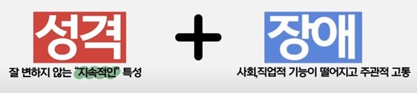 성격이란, ‘주위 환경과 자기 자신에게 반응하는 지속적인 특성들’이라고 말입니다. 중요한 키워드는 ‘지속적인’입니다. 성격은 잘 변하지 않고, 지속되고, 반복되는 일련의 패턴화된 특성들입니다. 특히 그 특성들 중 DSM-5에서는 1. 인지, 2. 정동(감정 반응), 3. 대인관계 기능, 4. 충동 조절 이 네 가지를 중요하게 바라보고 있습니다. 그리고 성격장애에서 ‘장애’는 Disorder의 의미로, 사회적, 직업적 기능이 떨어지고 주관적 고통이 있다는 의미 입니다.