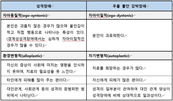 자아 동질적(ego-syntonic)이라는 뜻은 병의 증상이 스스로의 자아 정체성이나 자아인지와 부합한다는 뜻입니다. 또 환경 변형적(alloplastic)이라는 뜻은 병의 증상 때문에 생기는 갈등을 자기 자신이 아닌 주변 환경이나 다른 사람을 변화시켜서 해결하려고 한다는 뜻입니다. (아래 표 참조)