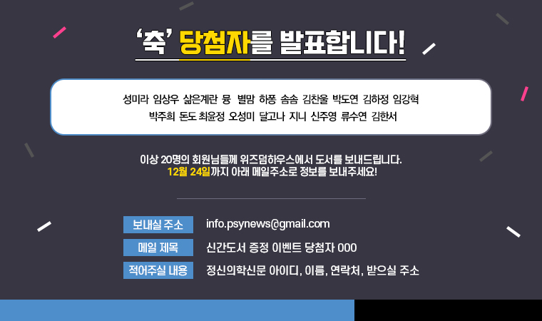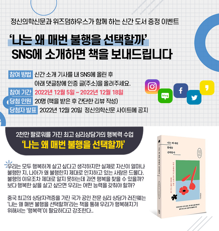 정신의학신문 info.psynews@gmail.com 다른기사 보기 저작권자 © 정신의학신문 무단전재 및 재배포 금지 추천 뉴스 매 맞는 여성 증후군 - 사랑이라는 이름의 폭력이 남기는 상처 얼만큼 운동해야 우울증을 예방할까? 영웅의 숨겨진 아픔 - 소방관 트라우마 약만으로 부족할 때, 우울증에 효과적인 운동은 이것입니다 불안이 쉽게 사라지지 않는 뇌과학적 이유 [신간소개] 당신의 상처는 사적이지 않다 수면다원검사를 꼭 받아봐야 하는 사람 (Part 3) 우울증에 좋은 운동은 뭘까 댓글삭제 삭제한 댓글은 다시 복구할 수 없습니다. 그래도 삭제하시겠습니까? 비밀번호 닫기 기사 댓글 25 댓글 접기 댓글 내용입력 비회원 로그인 이름 비밀번호 댓글 내용입력 댓글쓰기 계정을 선택하시면 로그인·계정인증을 통해 댓글을 남기실 수 있습니다. 회원 로그인 비회원 글쓰기 이름 비밀번호 자동등록방지 로그인 옵션 창닫기 댓글목록 최신순 추천순 욕설, 타인비방 등의 게시물은 예고 없이 삭제 될 수 있습니다. 돈도 2022-12-22 10:09:00 더보기 삭제하기 오예~~ 감사합니다!! 서평 잘 써볼게요^^ 김한서 2022-12-18 21:01:29 더보기 삭제하기 https://blog.naver.com/happy674/222959288941 늘 불행이 나만 쫓는다 느껴지는 순간이 많았던 저에게, 한해의 끝에서 새로운 계기를 만들어 줄 수 있는 책일 거 같아 꼭 읽어보고 싶어져요:) 류수연 2022-12-17 12:20:56 더보기 삭제하기 https://m.blog.naver.com/uoahn5/222958183238 스스로 인지하지 못하고 있던 불안이 무엇이며 이로 말미암아 나타나는 생각과 행동들을 어떻게 변화시킬 수 있는지 궁금해지는 책인 것 같습니다. 더 나은 자신이 되기위해 꼭 한 번 읽어보고 싶습니다! 신주영 2022-12-15 23:16:03 더보기 삭제하기 https://m.blog.naver.com/juyong4553/222956946144 앞으로 살아갈 길고긴 나날들을 어떤 마음가짐을 가지면서 살아야할지 고민하고 있었습니다. 책을 읽으며 해답을 찾았으면 좋겠습니다. 지니 2022-12-15 16:20:35 더보기 삭제하기 blog.naver.com/PostView.naver?blogId=fjqm_qkffps&Redirect=View&logNo=222956529757&categoryNo=19&isAfterWrite=true&isMrblogPost=false&isHappyBeanLeverage=true&contentLength=6224&isWeeklyDiaryPopupEnabled=false 이벤트 참여합니다. 어린 시절을 치유하며 사는 게 가끔은 버거운 제게, 잠시의 위로가 될 수 있을 것 같아요. 꼭 당첨되었으면 좋겠습니다! 주요기사 대인기피증 사회불안장애 극복하기 [Doctor's Mail] 연속된 사업 실패, 재기를 위해 노력하지만 힘듭니다 아직은 괜찮습니다 6화 나는 언제나 완성되어가는 중이다 불안장애와 공황장애 어떻게 다른가요 수면의 질과 ADHD의 상호작용 약만으로 부족할 때, 우울증에 효과적인 운동은 이것입니다