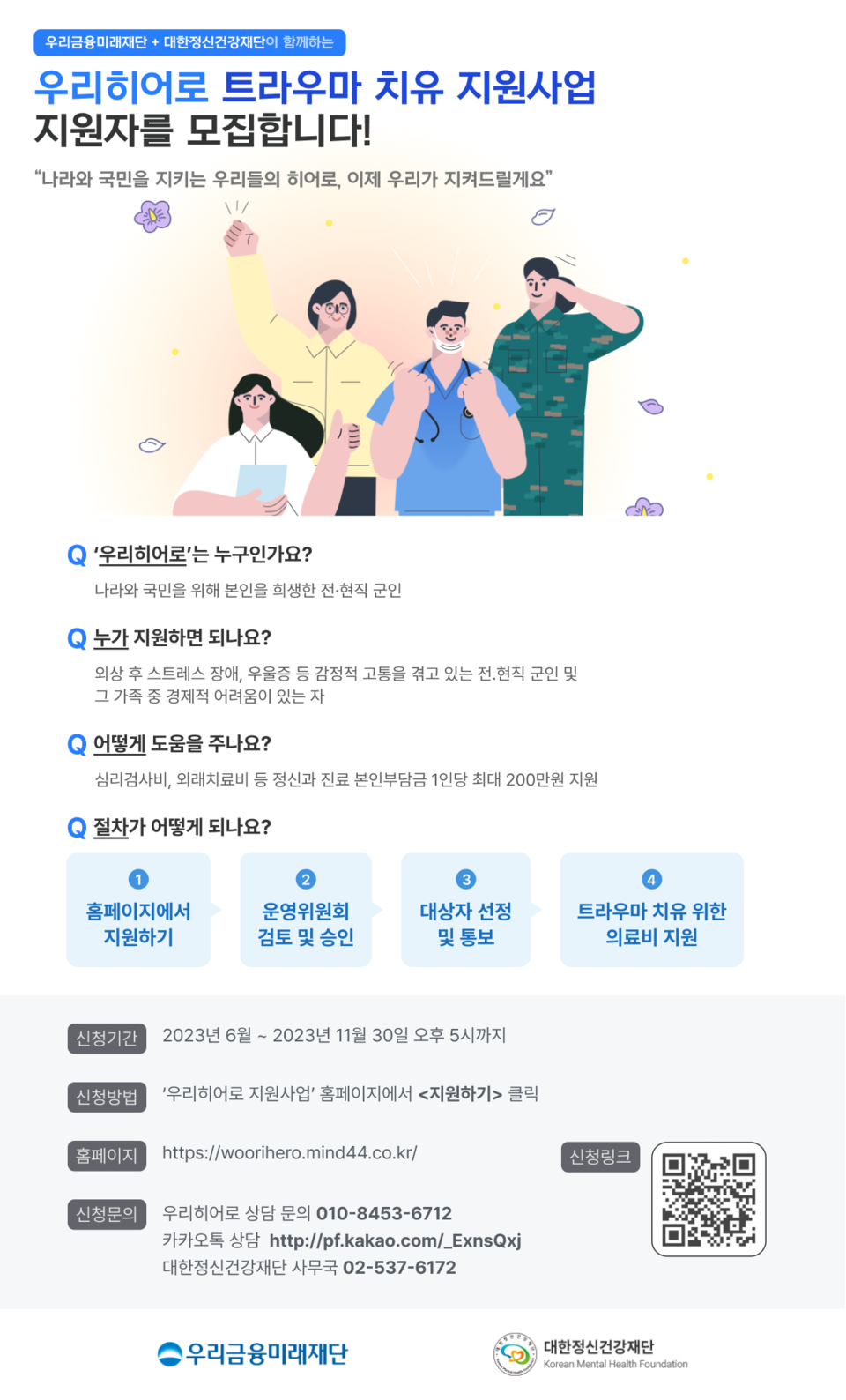 이에 대한정신건강재단은 우리금융미래재단과 함께 발굴된 우리히어로와 그 가족들에게 정신건강의학과 전문의를 연결, 최선의 치료를 제공하는 동시에 인식개선과 홍보활동을 펼침으로써 우리히어로의 명예와 자존감을 함께 지켜갈 계획이다.
