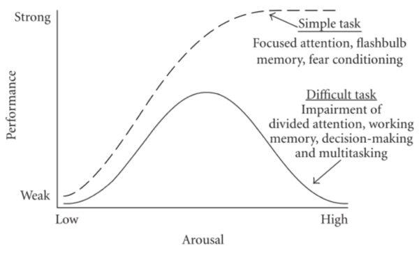 위의 그래프에서 볼 수 있듯, 인간은 각성(arousal) 수준이 높아질 경우 수행 능력(performance)도 함께 높아지는 양상을 보입니다. 간단한 집중력을 필요로 하는 일이나 단기 기억 등의 간단한 과업(simple task)은 일정 수준의 성과가 달성되어도 효율이 유지되는 반면, 분할 주의력, 작업 기억력, 의사결정, 멀티태스킹 등을 필요로 하는 어려운 과업(difficult task)은 효율이 점차 떨어져 수행능력이 현저히 저하됩니다.