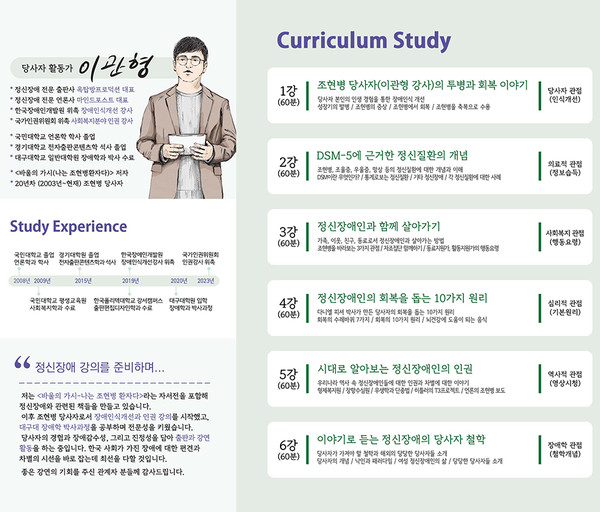 이번 강좌를 맡은 이관형 강사는 책 <바울의 가시(나는 조현병 환자다)>를 쓴 작가이자, 대구대학교 장애학 박사과정을 수료했다. 또한 보건복지부 장애인개발원의 장애인식개선 전문강사와 국가인권위원회 사회복지분야 인권강사로 활동 중이다. 또한 ‘세상을 바꾸는 시간 15분’과 CBS 방송 ‘새롭게 하소서’ 등 다양한 방송에 출연한 바 있다. 현재도 정신건강센터와 기관, 대학과 복지시설을 포함하여 여러 곳에서 활발한 강의활동을 이어나가고 있다.