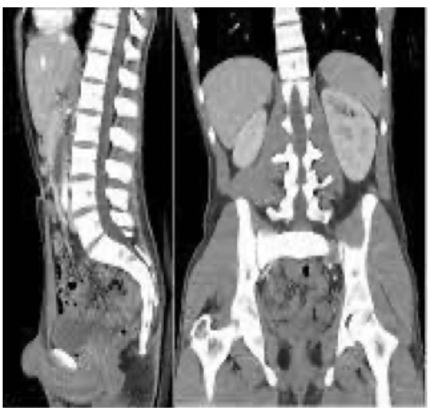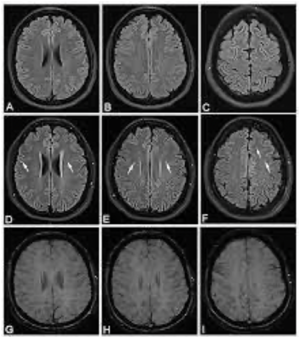 왼쪽 MRI 사진은 마치 부검한 것처럼 뇌를 잘라놓은 듯이 보입니다. 사진을 보시면 회백질과 백질 그리고 가운데 나비 모양으로 비어 있는 뇌실이 검은색으로 나타난 것을 찾을 수 있습니다. 이는 뇌실이 물로 차 있고, 물 분자는 확산이 잘되면 검은색으로 보이기 때문입니다.