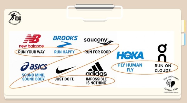 편지를 마무리하며 러너들이 사랑하는 대표 러닝화 브랜드들의 슬로건을 떠올려봅니다. 그 문장들에는 우리가 달리기를 할 때 떠올리면 좋은 여러 가지 의미가 담겨 있지요. 독자 여러분도 ‘구름 위를 달리듯’, 혹은 ‘날듯이 가벼운 몸과 마음으로’ 달릴 수 있기를 바랍니다. ‘건강한 정신이 건강한 몸을 만든다’는 사실을 기억하며, 각자 ‘선한 목적을 품고 달릴’ 수 있다면 더욱 좋겠습니다. 무엇보다 ‘불가능하다고 생각하지 않고’, 단 한 걸음부터 ‘시작해 보셨으면’ 합니다. ‘누구와도 비교하지 말고, 오직 나만의 속도와 방식으로’, 그리고 ‘즐겁게’요. 자기 돌봄을 위한 작은 실천으로서, 신발 끈을 묶고 밖으로 나가 천천히 걷기부터 시작해 보면 어떨까요? 언젠가 주로 위에서 마주쳐 환하게 인사 나눌 수 있는 날을 기대합니다.