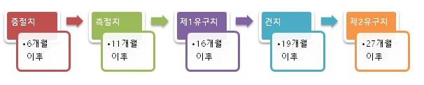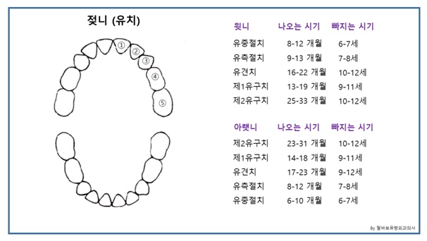 가장 많이 궁금해하시는 것은 역시 치아가 제대로 나고 자라고 있는가입니다. 유치는 생후 6개월부터 나기 시작합니다. 아래턱 가운데 앞니부터 시작하여 차례대로 위턱 큰 어금니까지 순차적으로 솟아납니다. 여기에서 중요한 것은 유치는 생각보다 자유분방한 치아라는 것입니다. 유치가 자라나는 순서는 매우 가변적입니다. 아래 표에 적어놓은 유치가 자라는 시기는 단순히 평균치이며 어느 정도 편차-6개월 정도-를 충분히 생각해야 합니다. 어떤 아이는 태어날 때부터 앞니를 가지고 태어나기도 합니다. 이런 경우 부모님들은 기형이 아닌지 걱정하시지만 대부분 정상 치아가 이른바, 조기 맹출한 경우이므로 걱정하지 않으셔도 됩니다. 가장 중요한 것은 자라나는 순서입니다. 한 쪽에 다섯 개의 치아가 순서대로 자연스럽게 자라야 하는데 순서가 뒤바뀌거나 예정되었던 치아가 자라지 않는다면 치과의사의 검진을 고려해 보셔야 합니다.