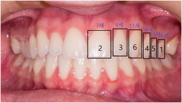 부모님들이 고려해야 하는 사항은 대략적인 영구치 맹출 시기입니다. 몇 살 때 어느 치아가 나야 하는지를 알고 계시다가 적정 시기가 되어도 흔들리지 않는 유치를 발견한다면 치과에 내원해서 검사를 시행해야 합니다. 빠질 시기가 되었는데도 남아있는 유치는 영구치의 맹출뿐만 아니라 턱뼈의 대칭적 성장에도 영향을 미칠 수 있기 때문이죠. 도표에 나타난 정확한 맹출 시기는 외우기가 어렵기 때문에 나이에 따라 어떤 치아가 나오는지 그림으로 대략적인 맹출 순서를 알아두시면 좋습니다.