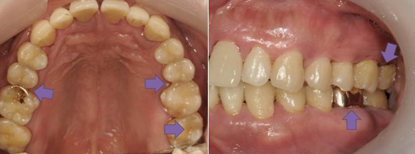하지만 대도시에는 슬럼가가 있듯이 입속에도 세균들이 숨어 사는 공간이 아주 많습니다. 다음 사진은 나름 구강 위생관리에 자신이 있으셨던 분의 사진입니다. 잇몸도 문제이지만 아주 많은 부위에서 충치가 발생할 수 있는 위험요소를 발견할 수 있습니다. 왼쪽 화살표부터 살펴볼까요.