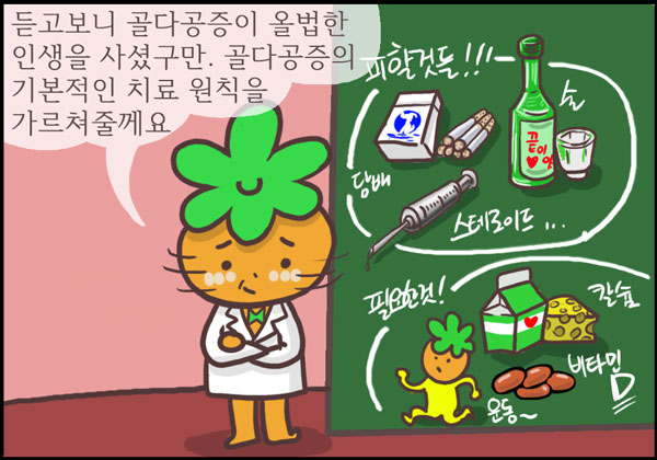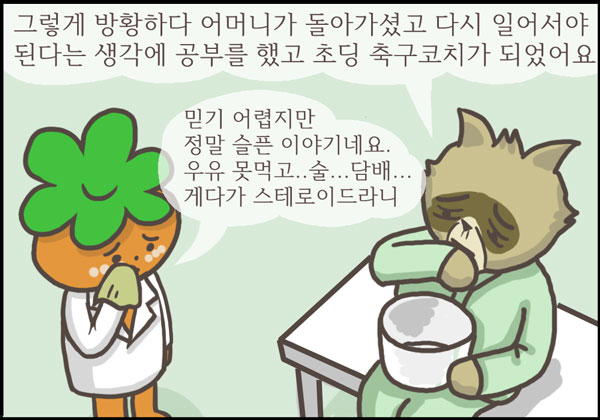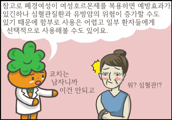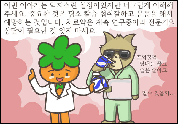 <3> 만화에서는 축구코치가 골다공증이 걸리는 것으로 설정했지만 실제로 대부분의 골다공증 환자는 폐경기 여성이거나 나이 많은 노인입니다. 하지만 코치처럼 몇 가지 위험인자를 방치하고 살았다면 골다공증이 금방 찾아 올 수도 있는 것입니다.