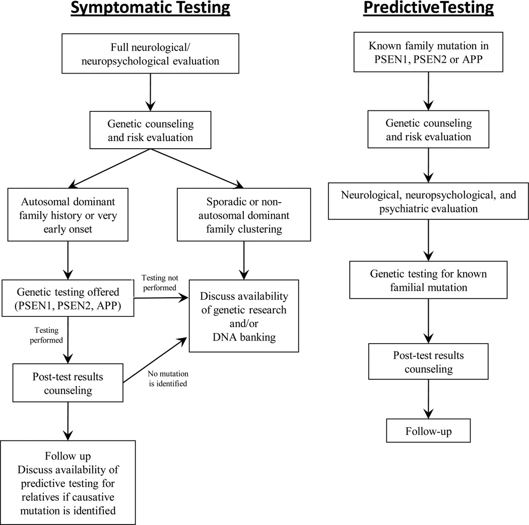 조기 발생 알츠하이머병은 유전학적으로 매우 큰 의미를 갖고 있습니다. 왜냐하면 가족력이 있는 경우가 매우 높기 때문입니다. 심지어는 우성유전의 패턴으로 나타나 한 가계 내에서 할아버지 세대(世代), 아버지 세대 그리고 손자 세대에 걸쳐서 매번 알츠하이머병이 발생하기도 합니다. 이런 경우에는 환자나 또는 그분의 형제들이나 자녀들을 대상으로 유전 검사를 시행해볼 수 있습니다. 유전 검사를 통해서 어떤 유전자의 돌연변이가 있는지, 해당 질병에 대한 이해를 높이며, 향후 질병 발생의 예측을 시도할 수도 있습니다.
