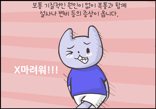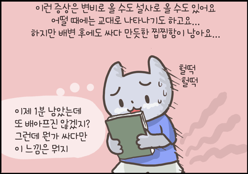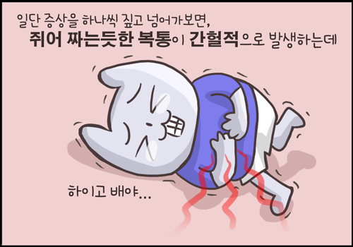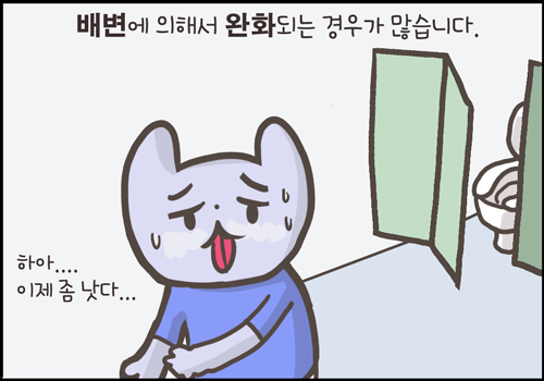단순히 배가 아픈 것이 아니라 ‘변의’를 일으키는 통증이라 환자들을 화장실을 자주 들락날락 거리고 일단 배변을 하게 되면 완화되는 경우가 많습니다.