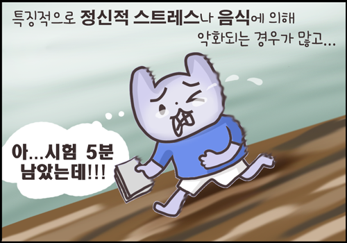 그런데 이런 증상이 정신적 스트레스나 음식에 의해 악화되는 경우가 많습니다. 그래서 매운 음식이나 자극적인 음식을 먹고 겪는 경우도 많고 시험기간같이 스트레스가 있을 때 경험하기도 합니다.